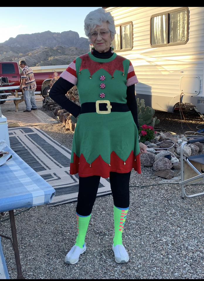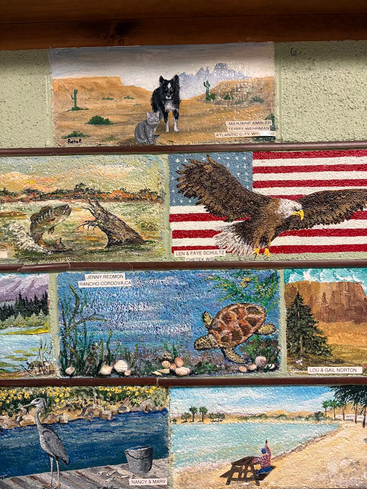 Reta was also one of the artists who painted the bricks in the Bingo Hall. This was a DooBees fundraising project to raise money for repairs and equipment for the DooBees Center and the Bingo Hall. Snowbirds paid about $50, and told various artists what they wanted on their brick. It has become a de facto record of many Snowbirds who are no longer coming to camp.