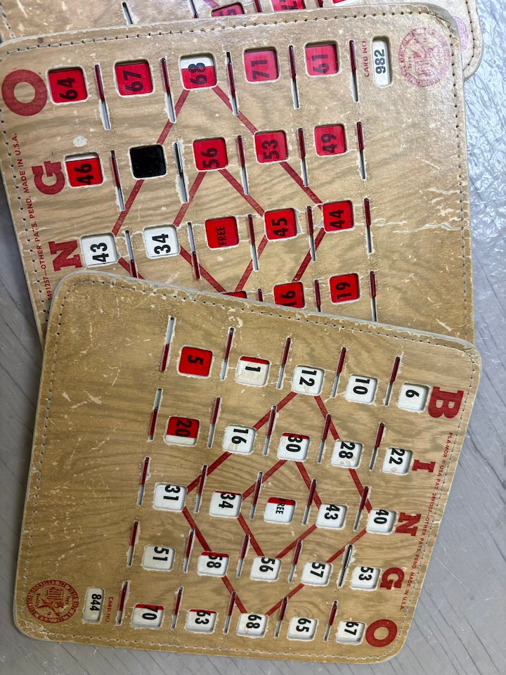 If you enjoy Bingo on Monday nights, you owe gratitude to Reta Psikla. Years ago, she spent many hours putting the number of each card into the computer system. “Once I got into a rhythm, it went quickly,” she said recently. You can see these old, primitive bingo cards on the shelf under the curtain opposite the pool table — little red cellophane windows you push open or closed. If you remember those days, leave a comment for others to see!